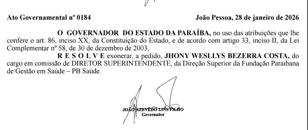 O governador João Azevedo exonerou, nesta quinta-feira (29), o presidente etadual do Avante, Jhony Bezerra, do cargo de Diretor superintendente da PB Saúde. O ato governamental foi publicado no Diário Oficial do Estado.